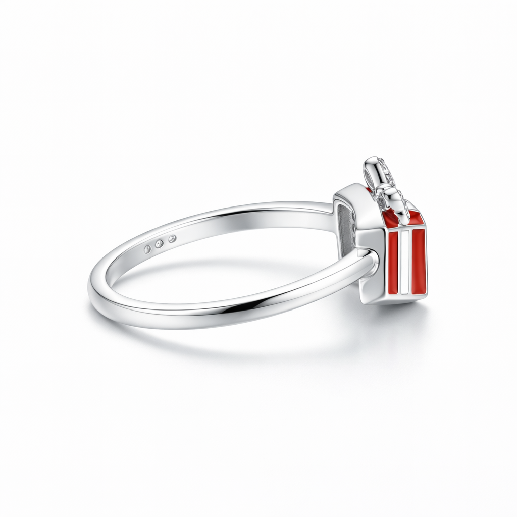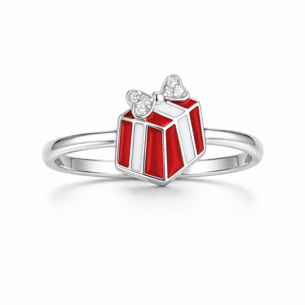 Adorable 92.5 hallmarked sterling silver ring for kids, featuring a cute red enamel gift box design with sparkling stone accents. Lightweight, skin-safe, and perfect for everyday wear or gifting.