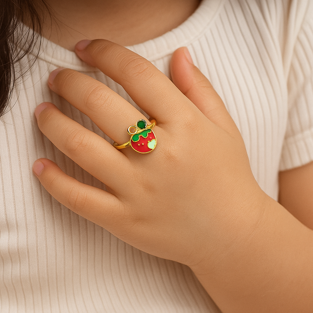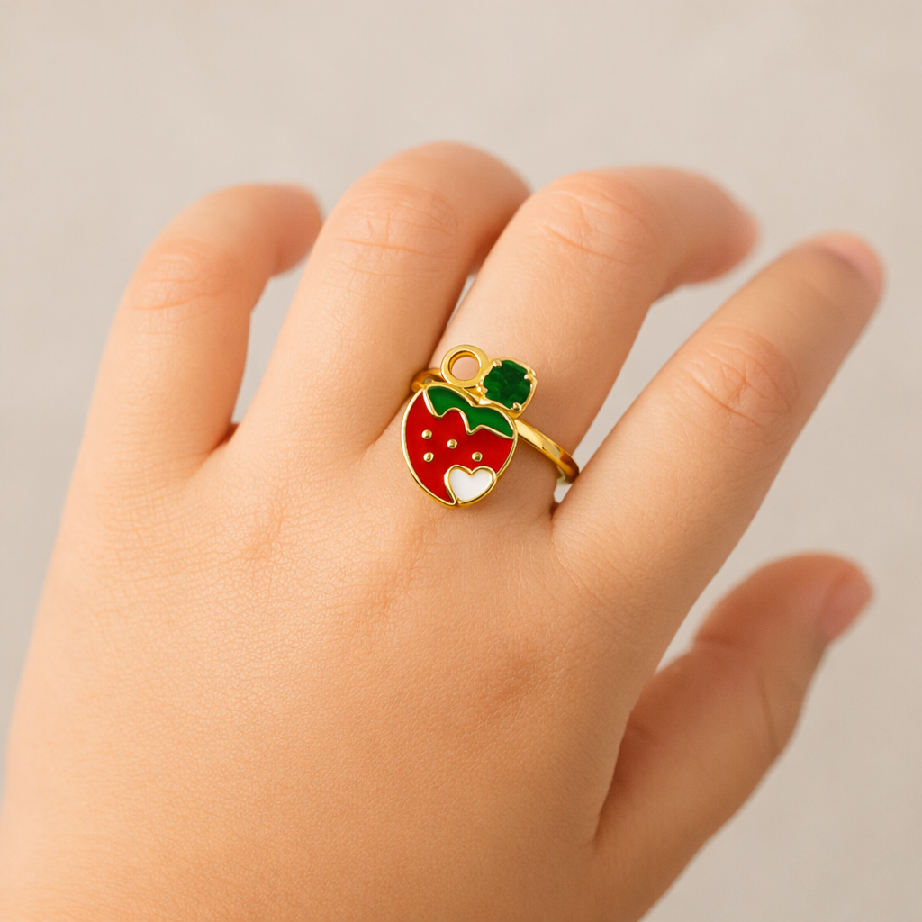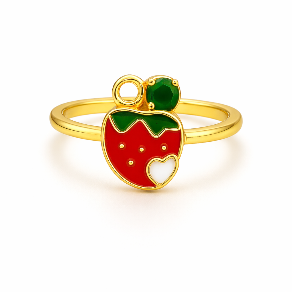 Adorable 92.5 hallmarked sterling silver ring for kids with a cute strawberry enamel design and gold-plated finish. Lightweight, skin-safe, and perfect for everyday wear or gifting.